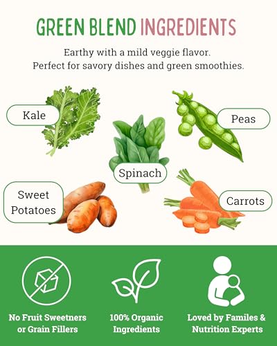 GREENS BLEND: Superfood-rich mix of kale powder, spinach, peas, sweet potatoes, and mixed greens—ideal for savory dishes and smoothies.